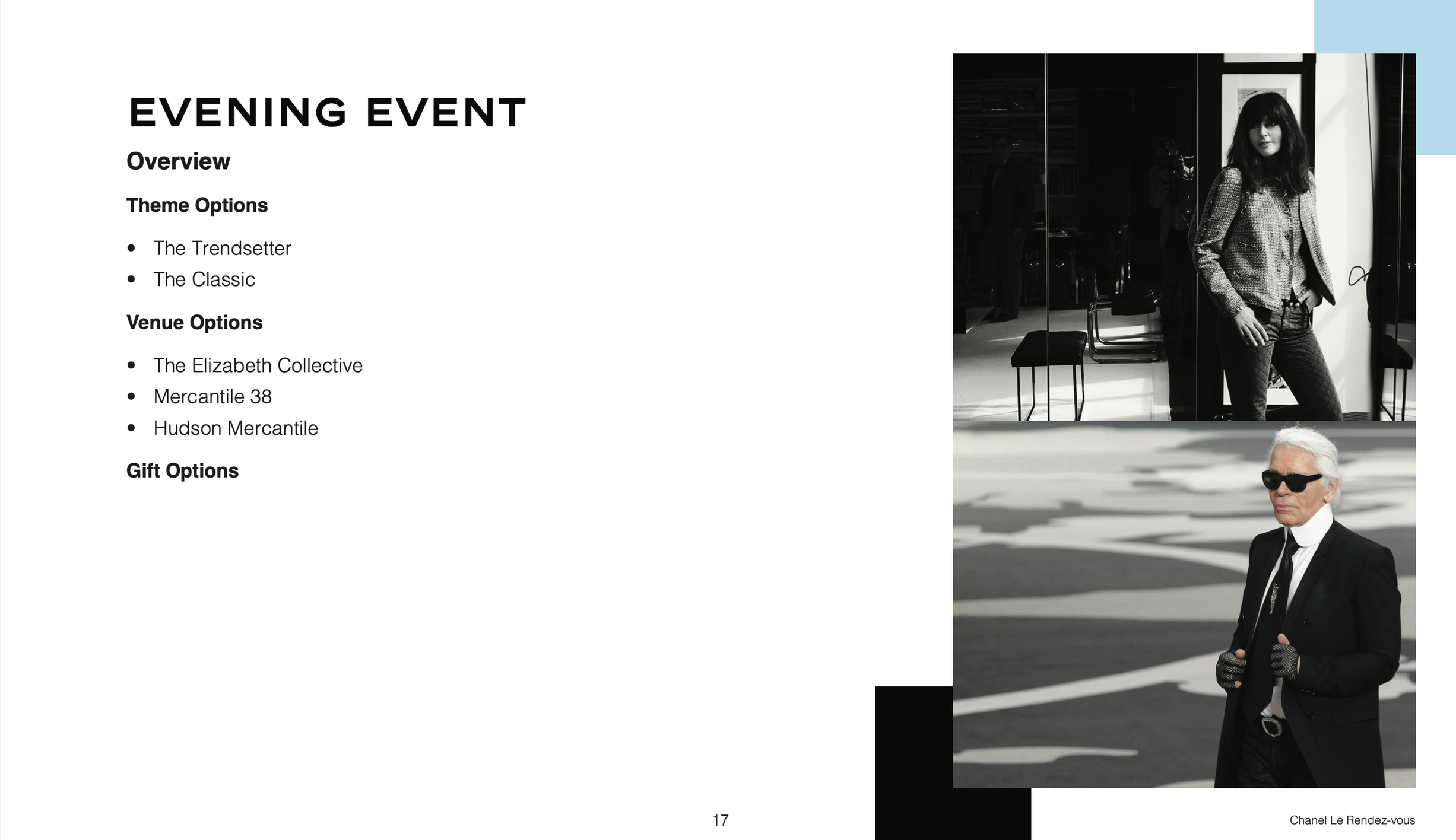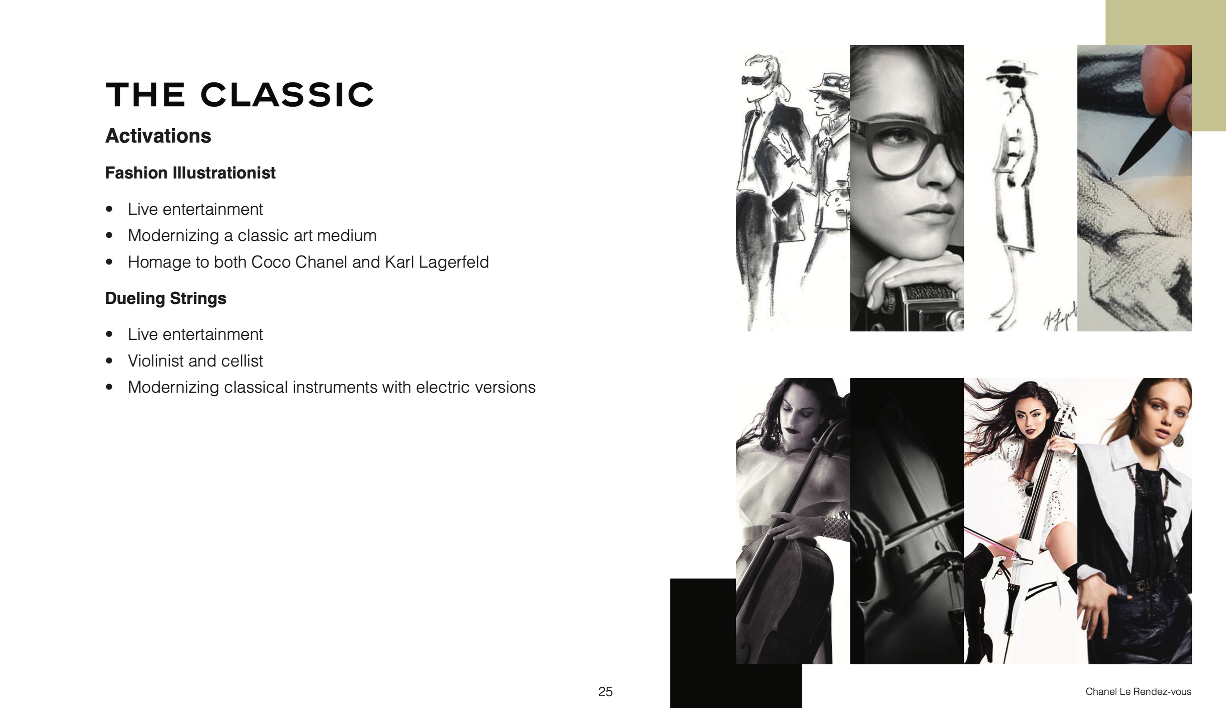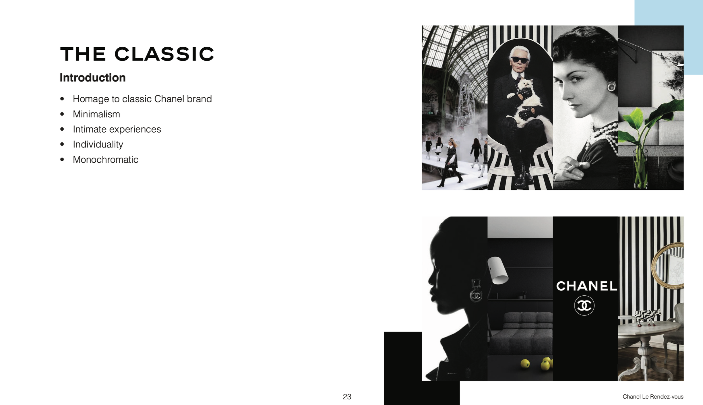 This RFP submission was developed during the pandemic as an appreciation experience for Chanel employees based in New York, a moment that required sensitivity, refinement, and a deep understanding of brand heritage. The proposal centered on two distinct concepts, each rooted in Chanel’s iconic history, timeless codes, and unmistakable style language. Rather than designing a traditional celebration, the experience was crafted to feel intimate, thoughtful, and aligned with the maison’s elegance, blending fashion-forward activations with curated moments of connection.