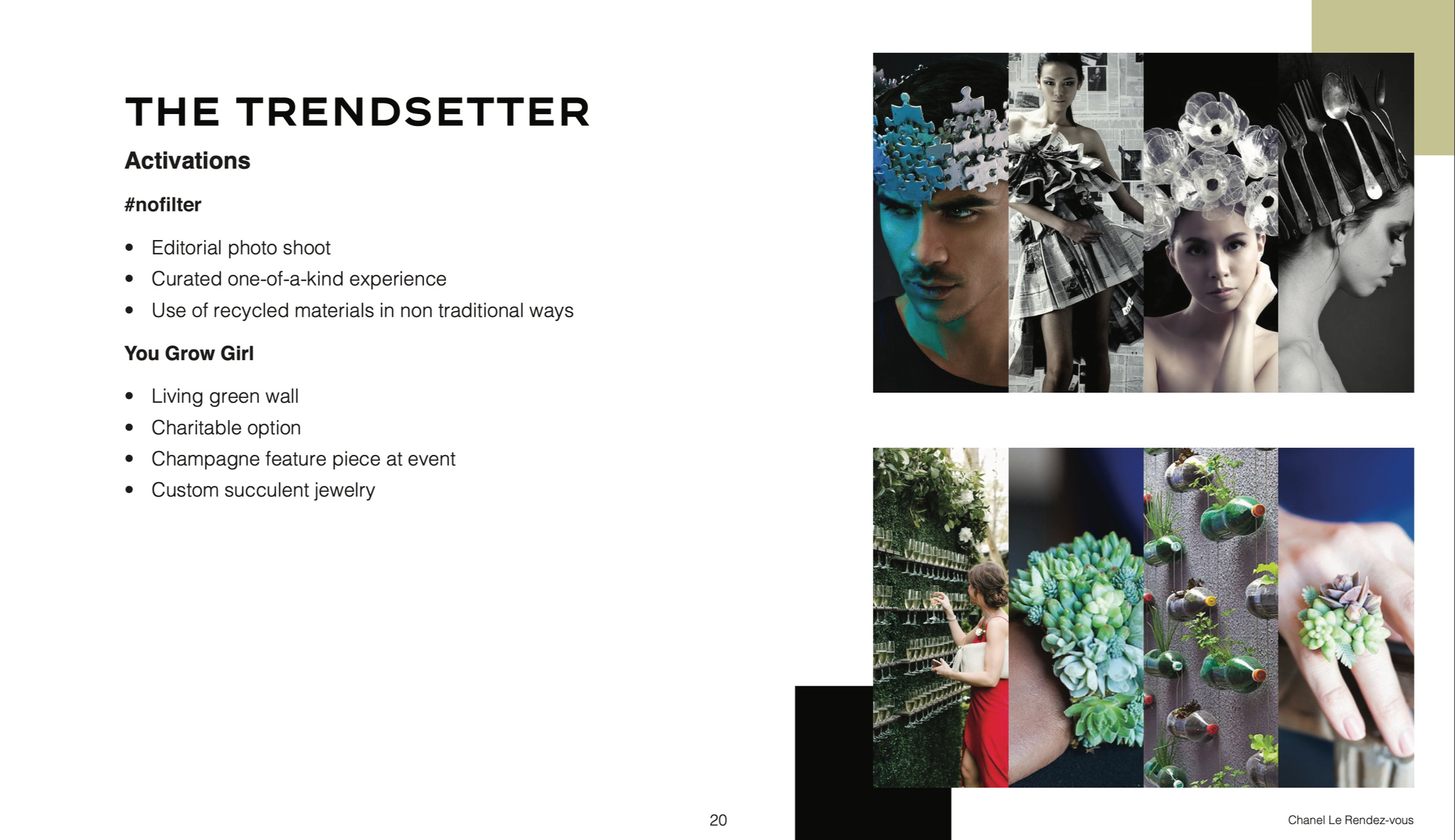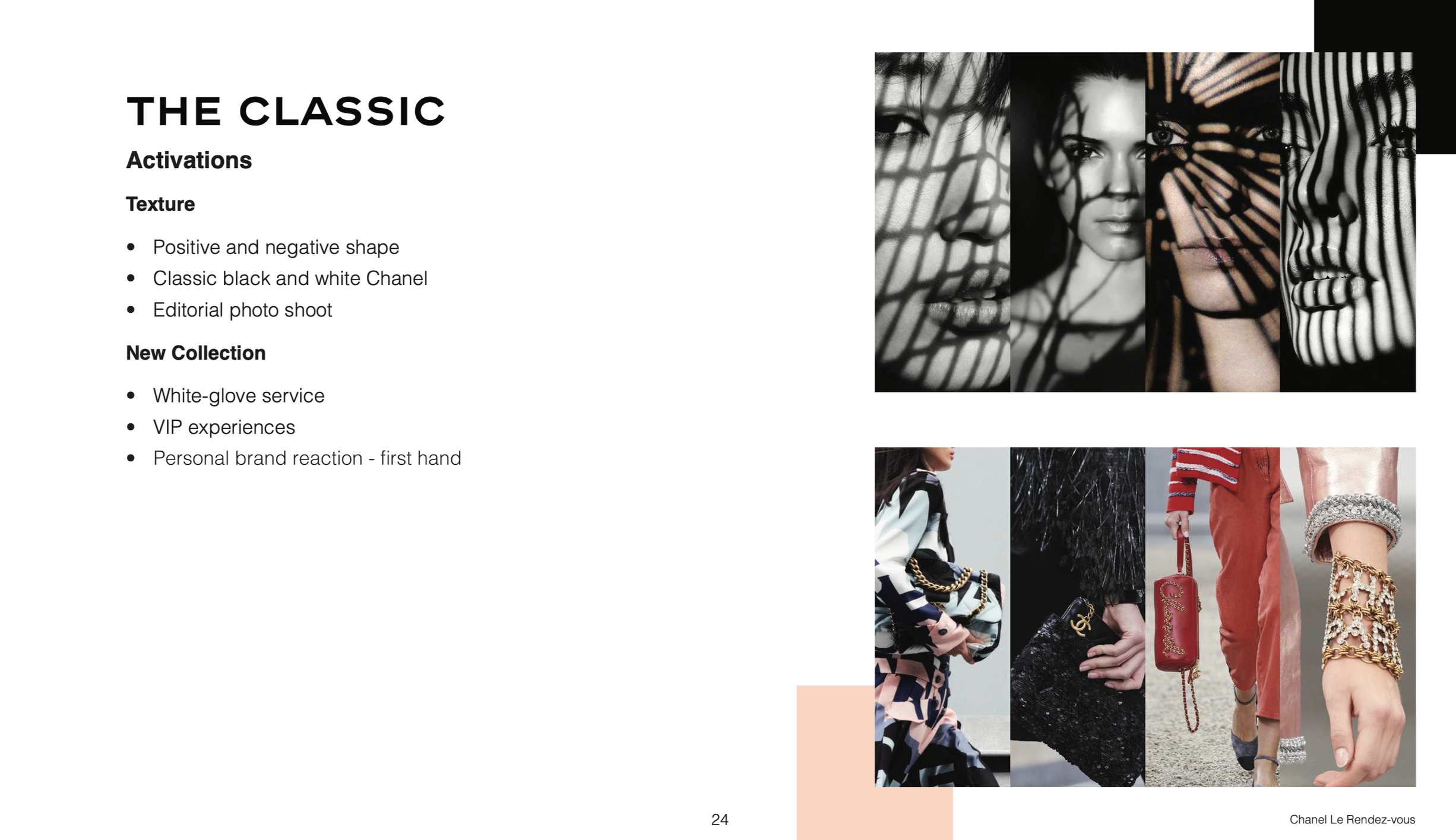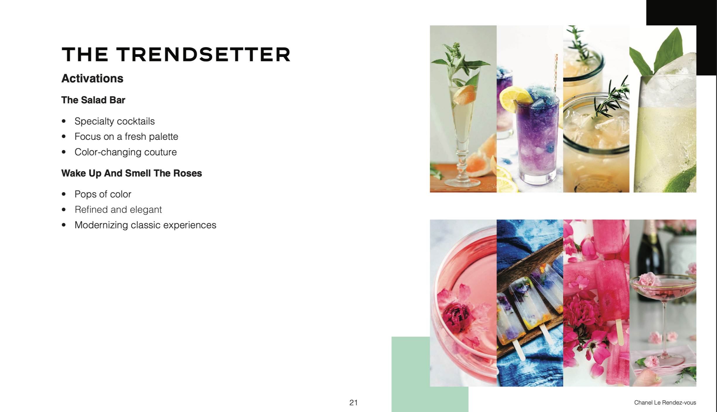This RFP submission was developed during the pandemic as an appreciation experience for Chanel employees based in New York, a moment that required sensitivity, refinement, and a deep understanding of brand heritage. The proposal centered on two distinct concepts, each rooted in Chanel’s iconic history, timeless codes, and unmistakable style language. Rather than designing a traditional celebration, the experience was crafted to feel intimate, thoughtful, and aligned with the maison’s elegance, blending fashion-forward activations with curated moments of connection.